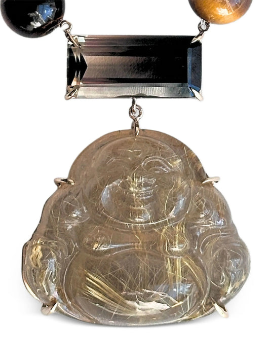 14K white gold Happy Buddha smoky quartz and tigers eye necklace