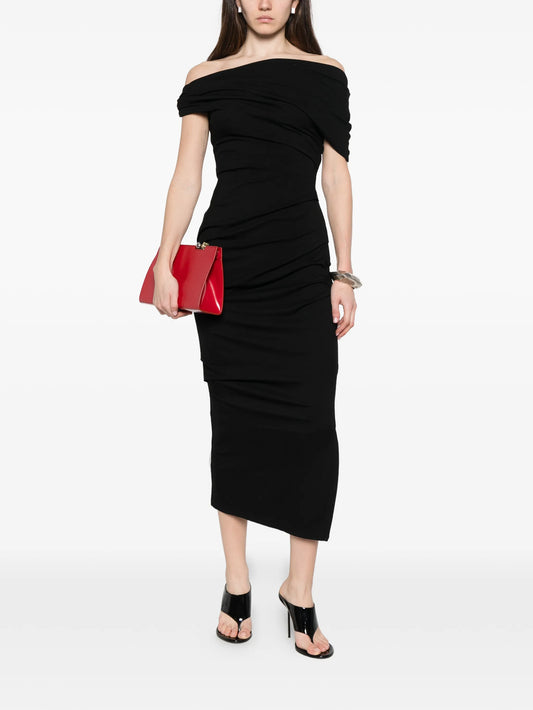 one-shoulder gathered midi dress