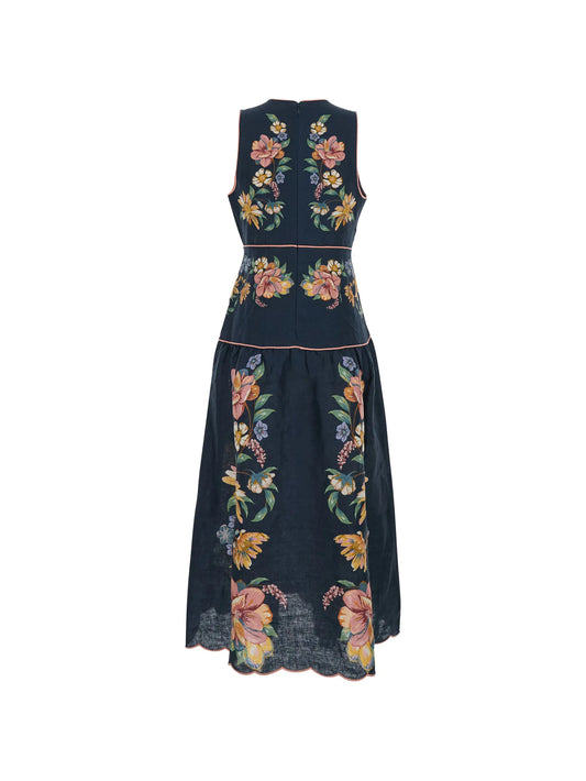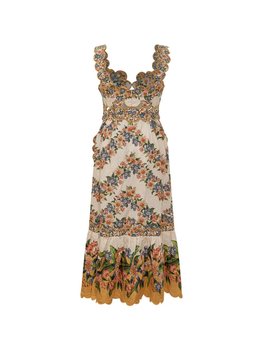Sand Hilo floral scalloped midi dress