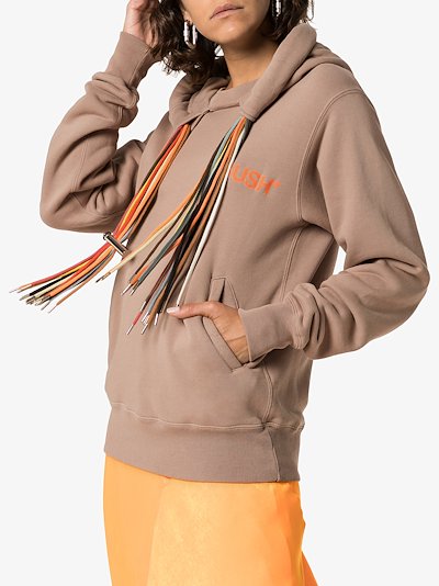 This beige Ambush hoodie features long sleeves, side pockets, ribbed hem and cuffs and orange logo print to the front. The relaxed fit is finished with multiple multicoloured drawstrings and silver tone hardware. ‘This is not an ambush,’ they said. Although we should have suspected trouble when you walked into the room and caught everyone's attention with this Ambush sweater.