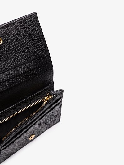 This black Gucci GG Marmont leather card case has been designed with exacting detail in Italy. Rendered in textured leather, this style has a gold tone GG front plaque, zippered coin section, embossed interior logo, snap button fastening, four inner card slots and a fold over fastening. Slyvia Plath once famously said that a woman must have a purse and a room of her own to be independent in life. We decided on the Gucci GG Marmont leather wallet style.